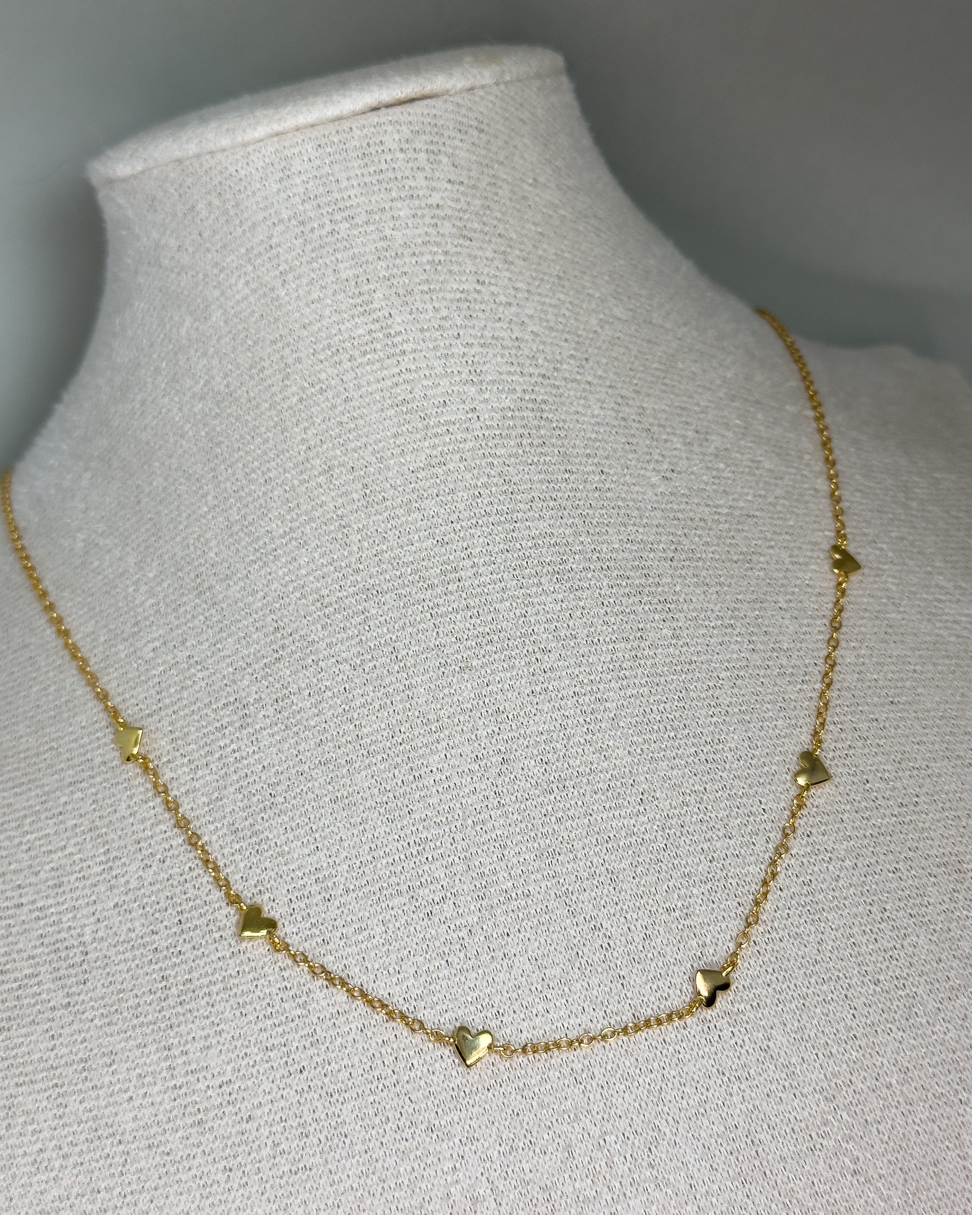 This delicate gold necklace features charming small solid hearts, making it a perfect accessory for everyday wear. Its subtle design allows effortless layering with other necklaces, adding a touch of elegance to any outfit.